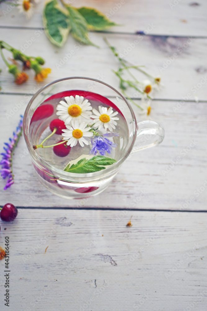 Flower tea. Transparent mug with a drink with chamomile flowers and cherry berries on a wooden table