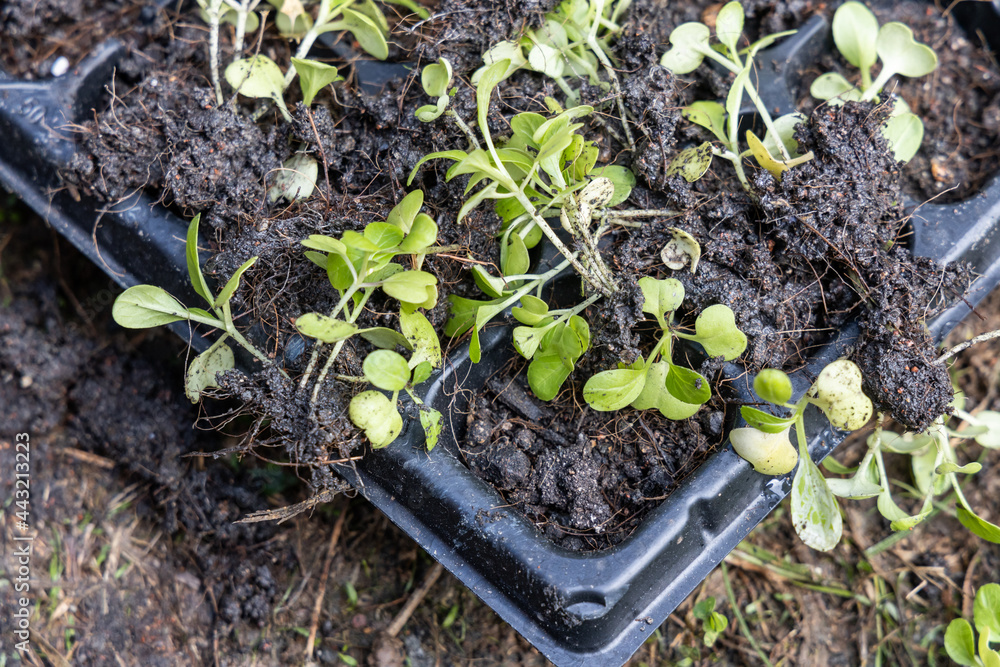 Germinated vegetable with poor health due to overly watering with wet soil that rot the roots