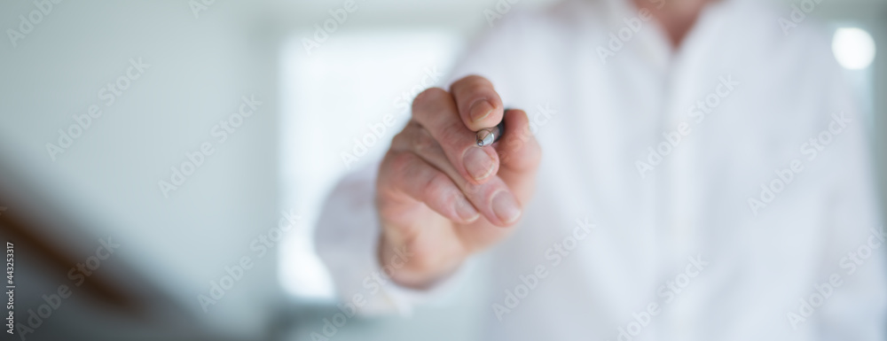 Hands communicate and present in everyday office life with a pen and smart phone. Office scene with short depth of field.