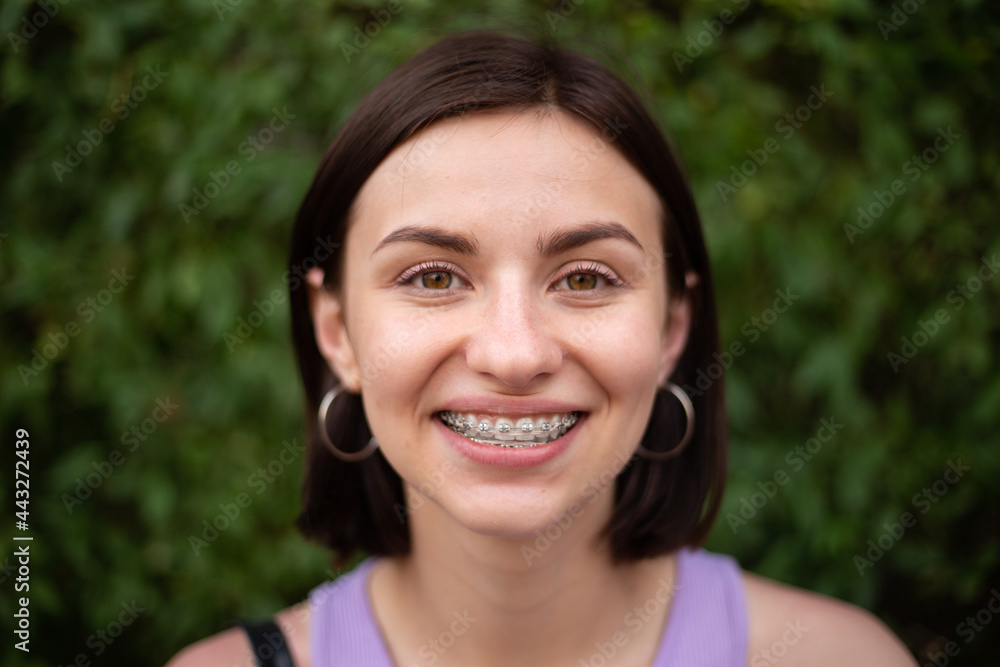 Young girl smiling with metal dental braces on teeth