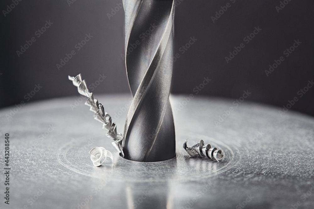 metal drill bit make holes in steel billet on industrial drilling machine. Metal work industry. multi cutting tool and end mill.