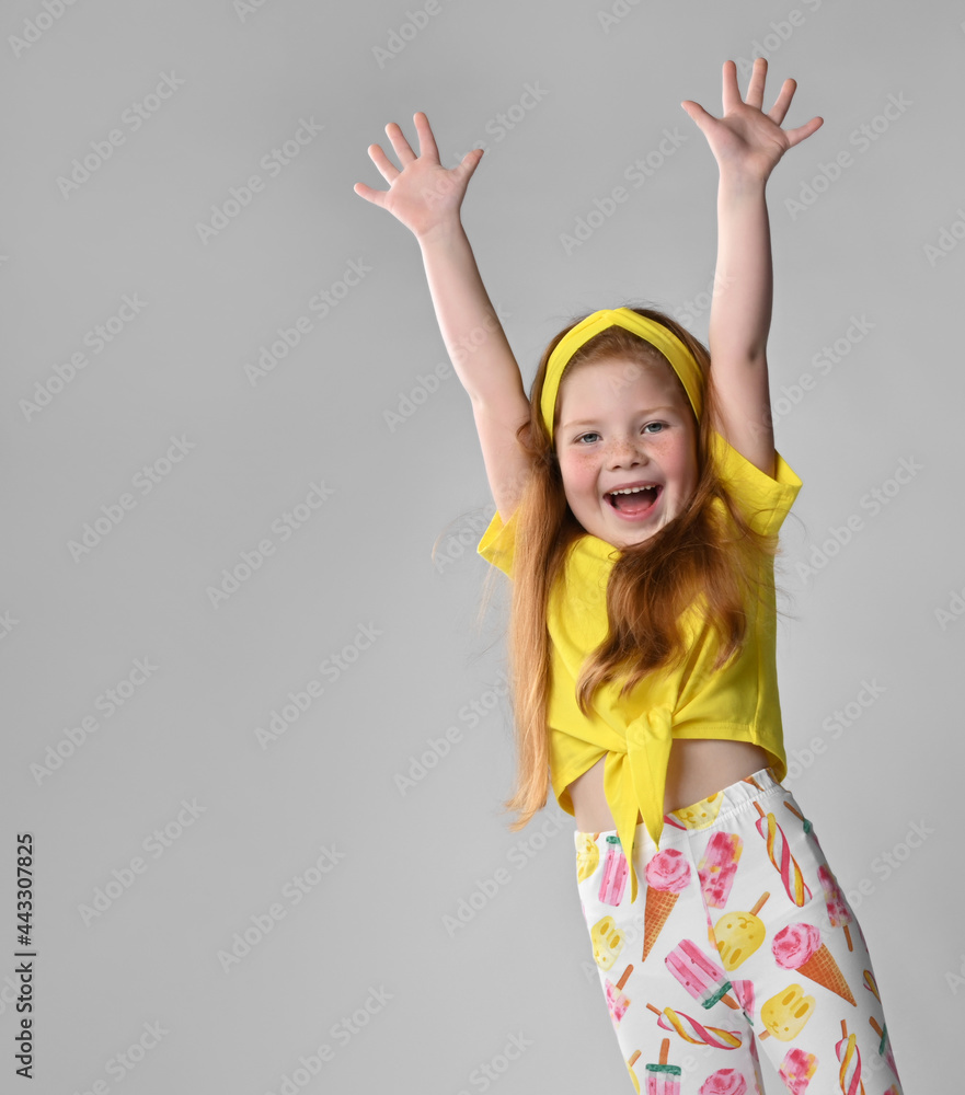 Happy happy little red-haired girl in summer fashionable outfit rejoices with raised hands, showing happiness and satisfaction emotions, having fun standing against studio wall background