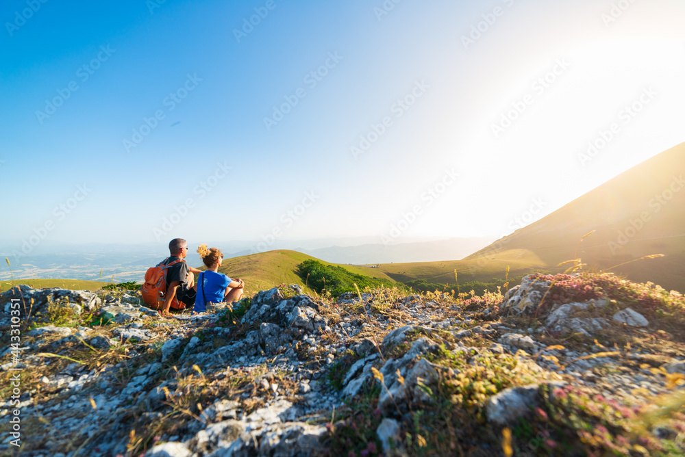 Man and woman hiking in the mountains of Umbria region, Monte Cucco, Appennino, Italy. Couple watching sunset together on mountain top. Summer outdoors activity.