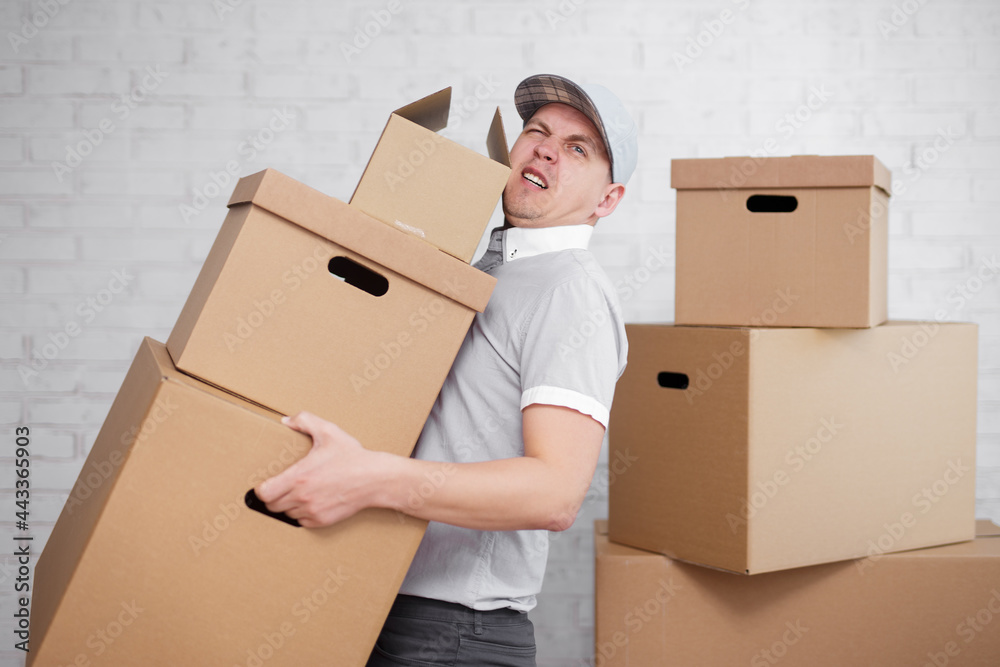 Tired deliveryman holding many boxes in hands.