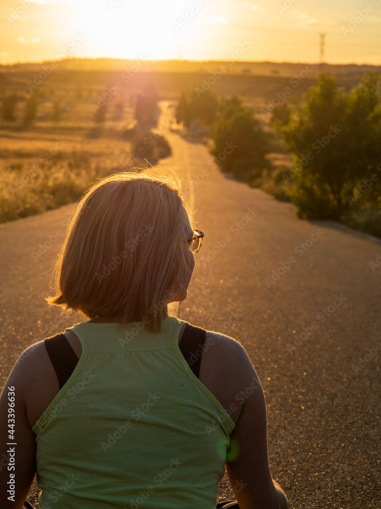 Girl sitting on her back on the road with a sunset. Image of tifestyle, relax and travel