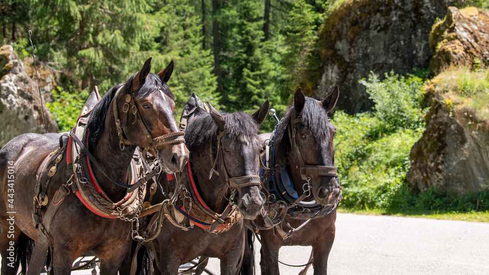 Norikerpferde vor der Kutsche, Dreispänner - Troika
