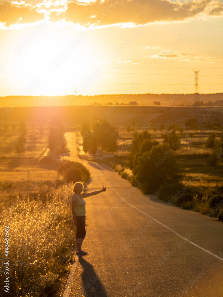 Girl doing autostop on the road with a sunset. Image of tifestyle, relax and travel