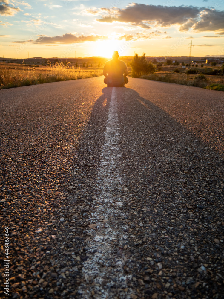 Strong man with his back turned on a road with the sun facing him at sunset. Summer sport image
