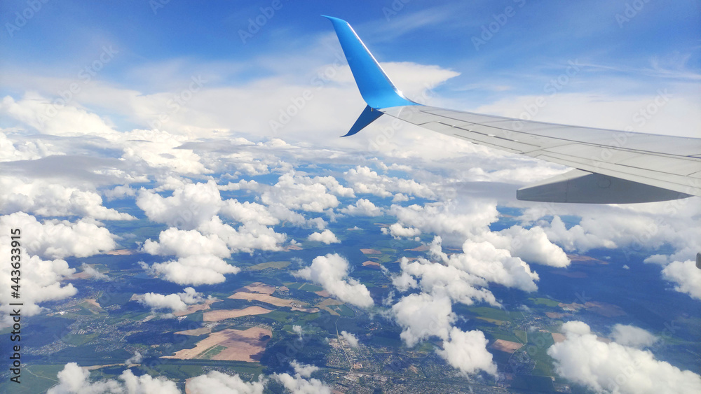 View from the plane window with the wing of a passenger plane on the background of the horizon and the blue sky with beautiful white lush clouds