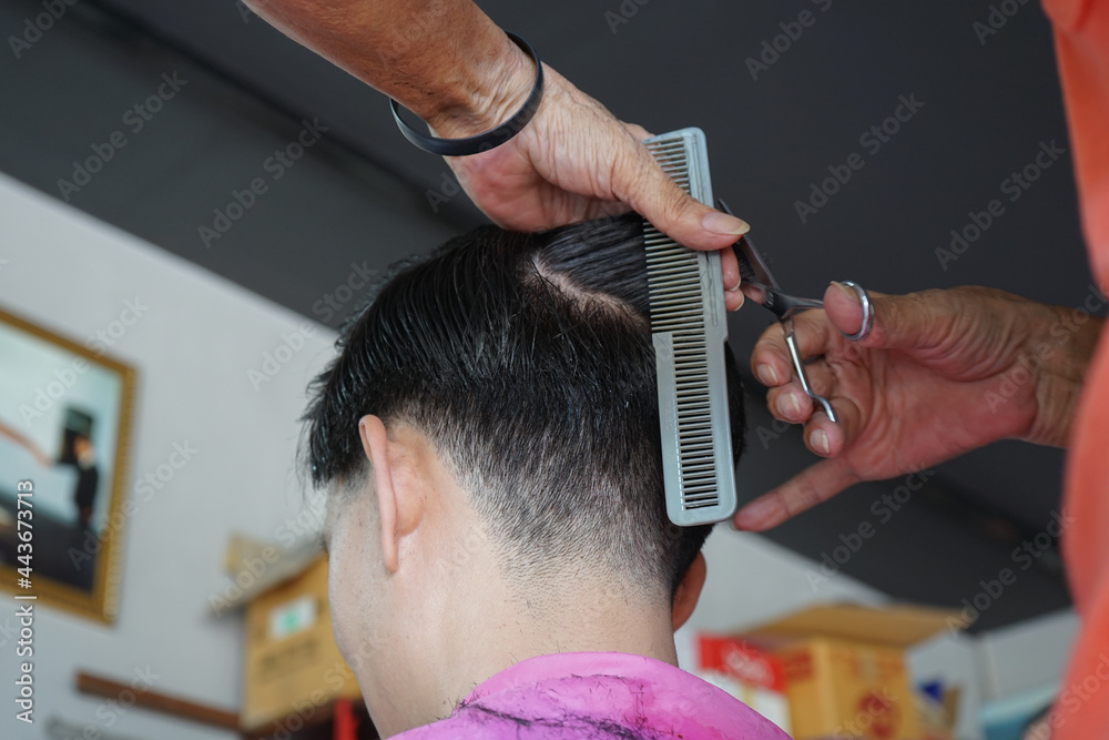 Closeup hands of hairsltylist and rear view of man having a hair cut by scissors and comb.