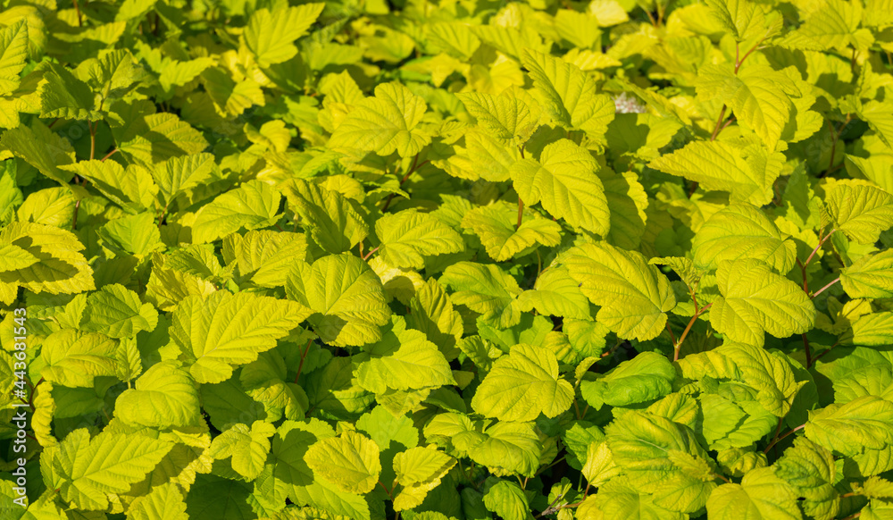 Close-up of Physocarpus opulifolius Nugget or Ninebark with golden leaves on terraces in public landscape city park Krasnodar or Galitsky. Spring landscape, fresh wallpaper with copy space