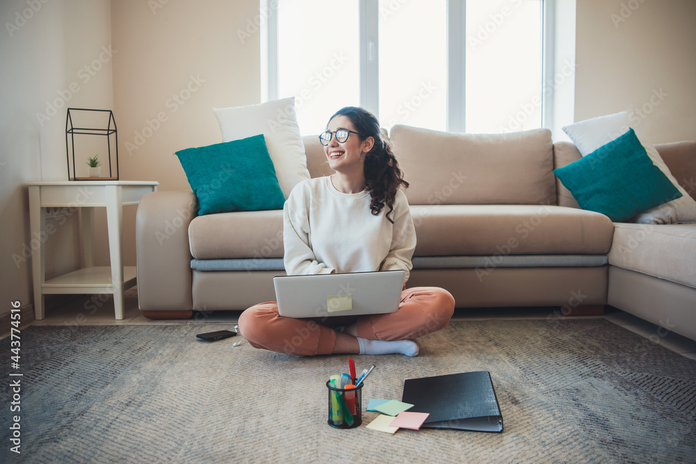 Adorable student on the floor smiling and using her pc while doing some university work