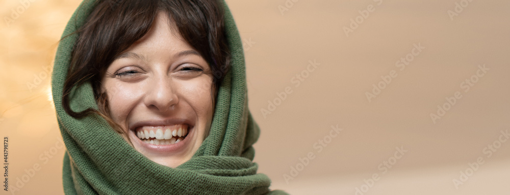 Attractive smiling caucasian women with green knitted scarf wrapped around her head. Female emotions. Banner format.