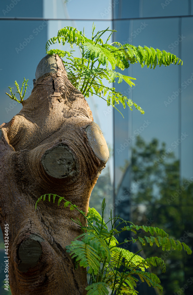 Close-up of Delonix regia tree (Flamboyant or Royal Poinciana tree) with fresh leaves in mirror maze. Rare tree grows in public city park Krasnodar or 'Galitsky' in June 2021