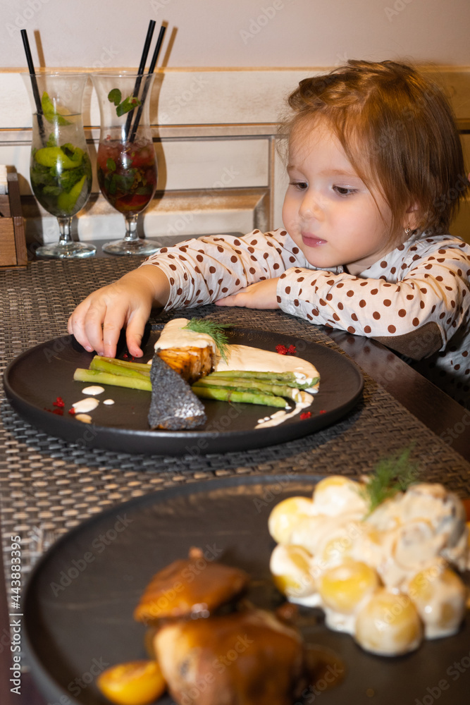A little girl in a restaurant looks at a freshly brought fish dish on the table in front of her and wants to take some caviar from the plate with her hands to taste it. the dish looks very appetizing