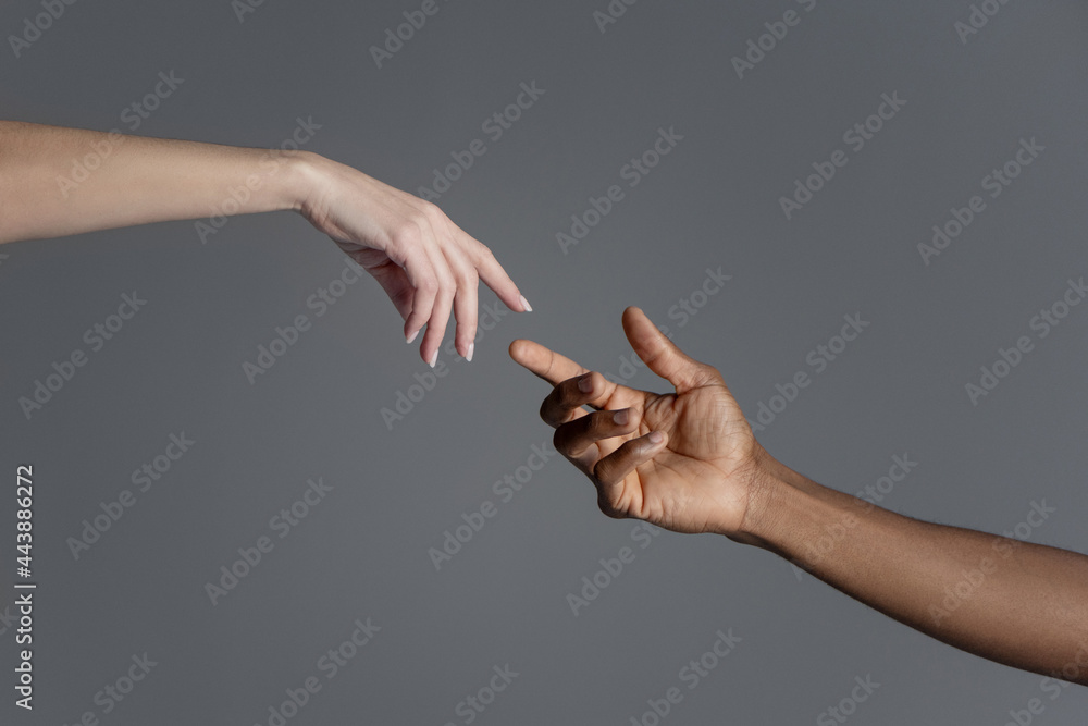 Male and female hands reaching out to each other copying creation of Adam sign.
