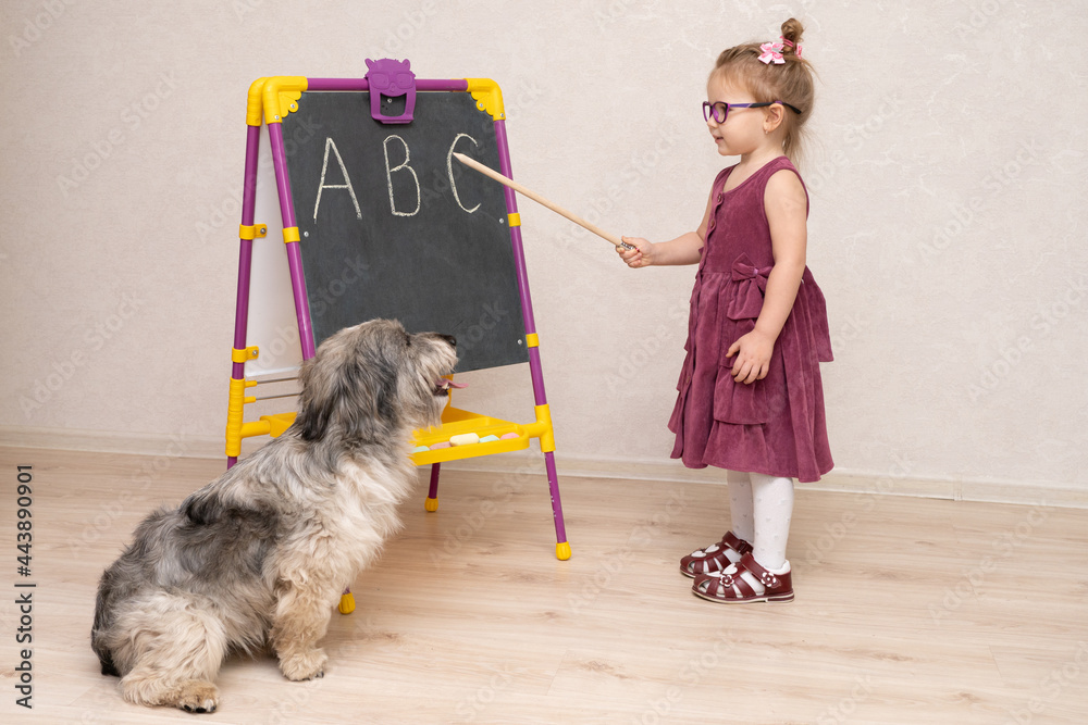 a girl is playing school with her mongrel dog. On the blackboard, she shows her pet the letters. The dog looks attentively at his mistress