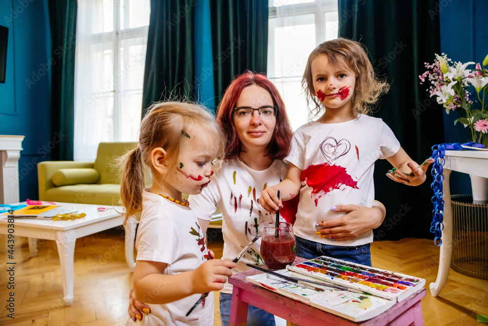 Family hobbies leisure activity home concept. Mother and small daughter drawing with fun using paintbrushes and watercolors. Children and parent creating picture together, body paint, home quarantine