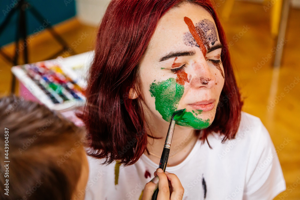 Family leisure activity home concept. Mother and small daughter drawing, fun using paintbrushes and watercolors. Children and parent creating picture together, watercolor on face, home quarantine