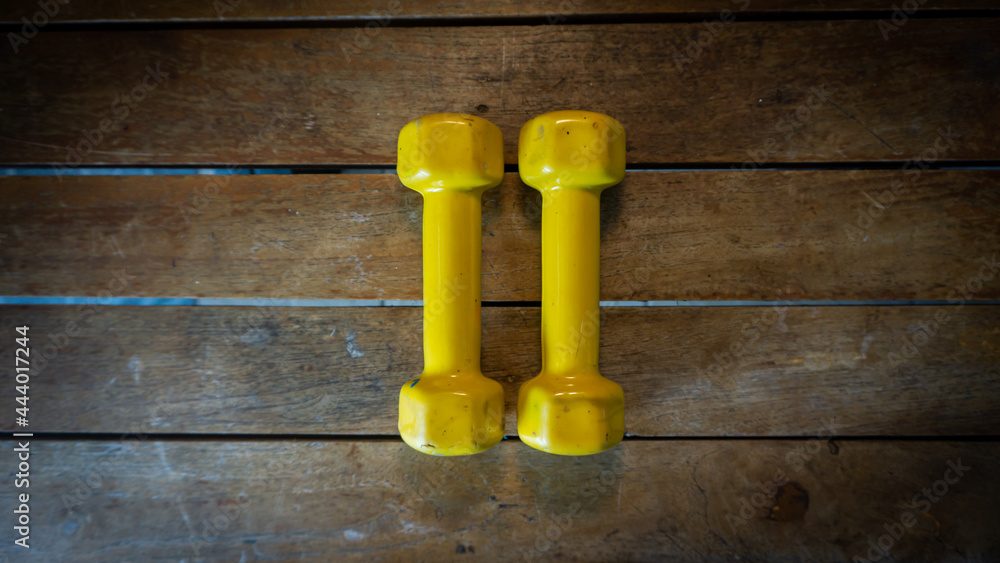 Top view of pairs of 1 kilogram yellow mini dumbbells on wooden backgrounds. Exercise tool and fitness equipment.