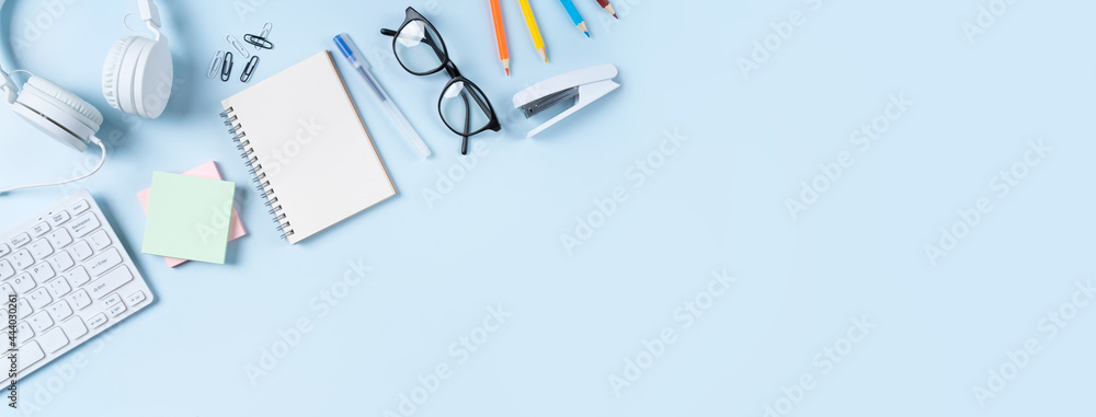 Online learning design concept. Top view of student table with computer, headphone and stationeries.