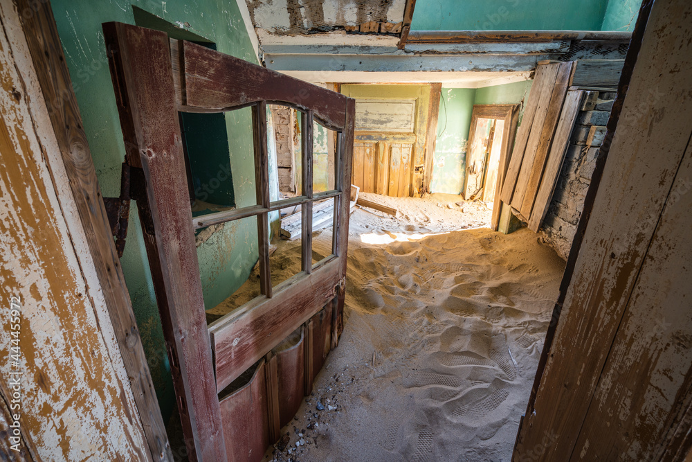 Abandoned building being taken over by encroaching sand in the ghost town of Kolmanskop near Luderitz, Namib Desert, Namibia.