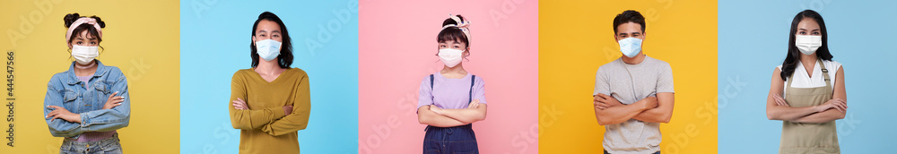 Collage of portraits and Happy asian teen faces of group of wearing face mask protecting from Corovavirus. health care and protective concept.