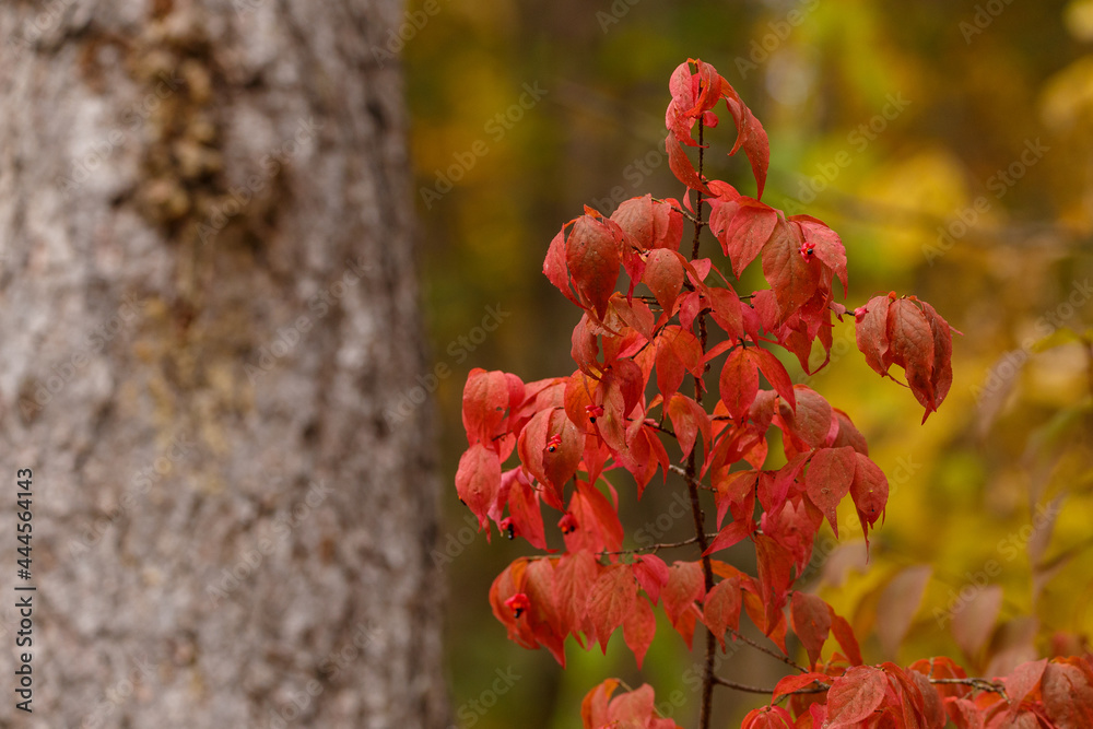 Red leaves of a bush against a background of green forest. Autumn forest. Close-up.