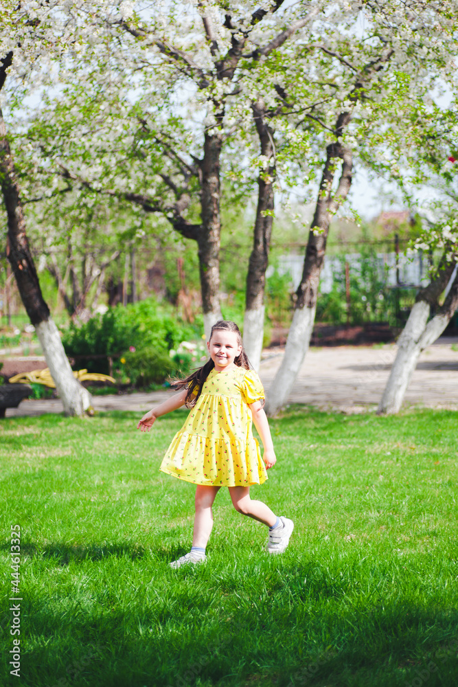 a six-year-old happy girl runs on a green lawn in the park and has a good time, family activity on the weekend.