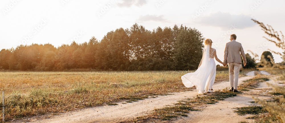 Bride and groom on wedding day hug and walking along the road to the forest at sunset