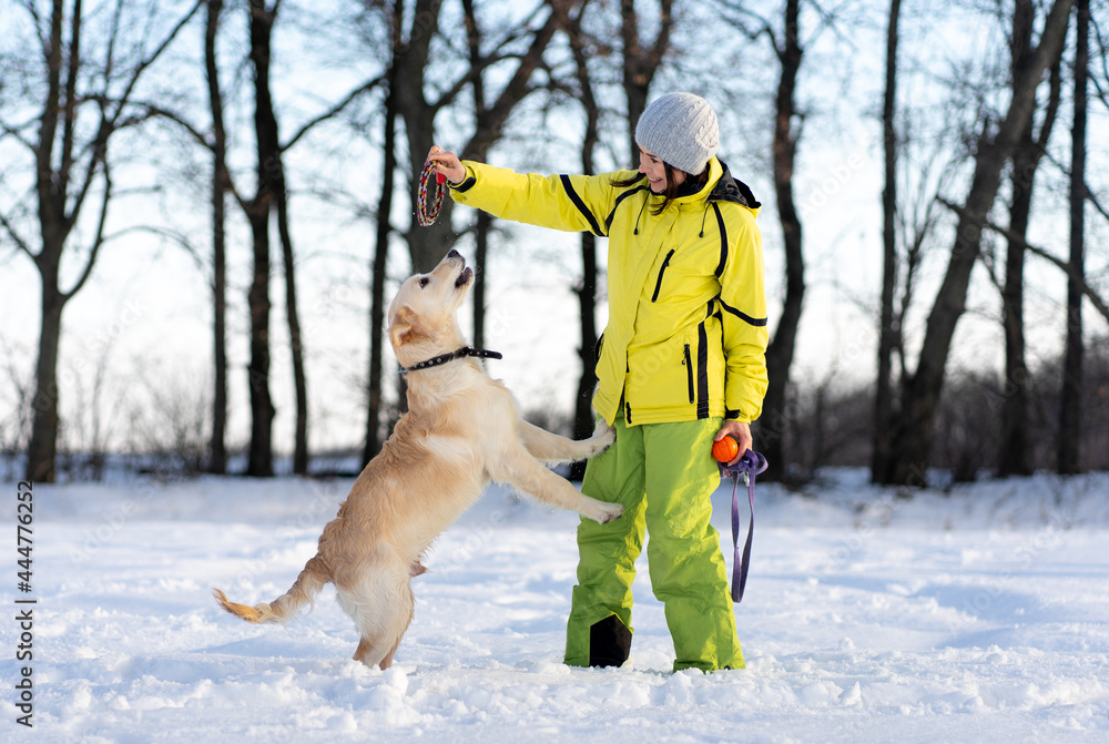 Active young retriever dog playing with happy woman outside in winter