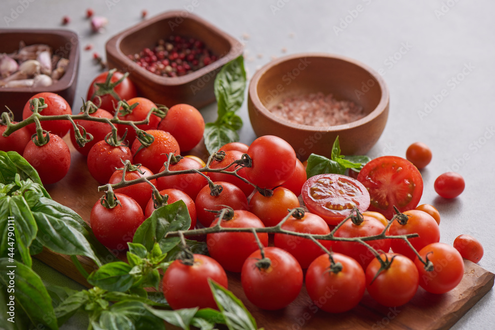 Fresh red variety of tomatoes with basil spices, pepper. Tomato vegetable concept. Vegan diet food. Harvesting tomatoes. Fresh tomato used for cooking.Top view.