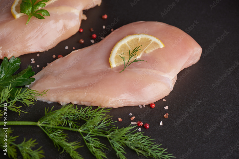 Raw chicken Breasts on a chopping Board. Fresh fillet. Fresh chicken meat, Chicken fillet with spices at black stone table. Top view with copy space.