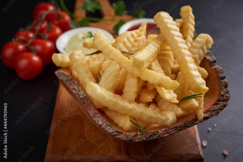 Homemade baked potato fries with mayonnaise, tomato sauce and rosemary on wooden board. tasty french fries on cutting board, in brown paper bag on black stone table background, unhealthy food.