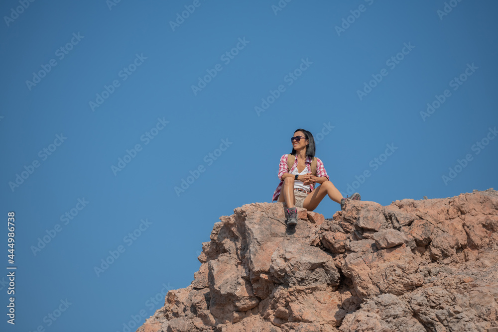 fit young woman hiking in the mountains standing on a rocky summit ridge with backpack and pole looking out over landscape. hiker with backpack relaxing on top of a mountain and enjoying valley view.