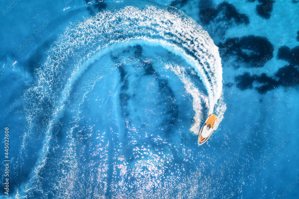 Aerial view of the speed boat in clear blue water at sunny day in summer. Top view from drone of fast floating yacht in mediterranean sea. Travel in Oludeniz, Turkey. Tropical landscape with motorboat