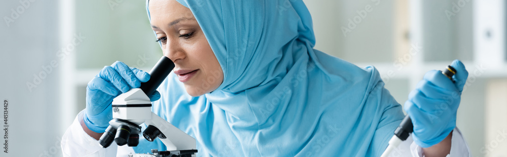 Muslim scientist in medical mask holding pipette and looking through microscope, banner