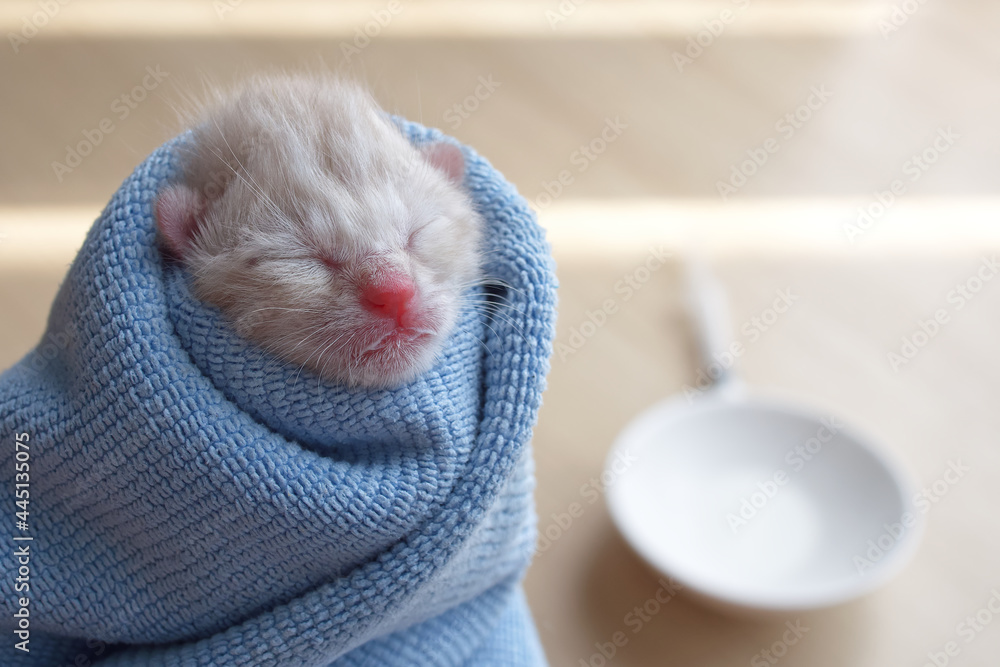 Caring for orphaned cat, Newborn kittens adorable, Feeding goat’s milk instead of mother’s milk, Wrapping in cloth to warm and maintain body temperature on blurred background with copy space.