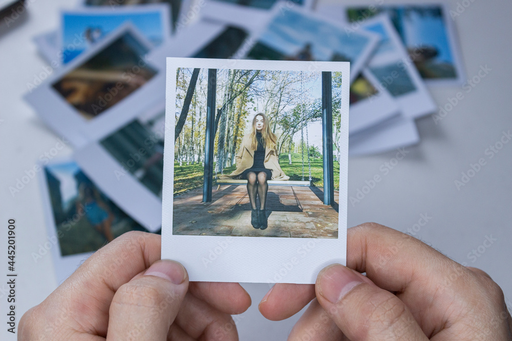 A person holds a polaroid photo in his hands against the background of other photos. Photo in hand close-up. A person looks at a photo from a polaroid.
