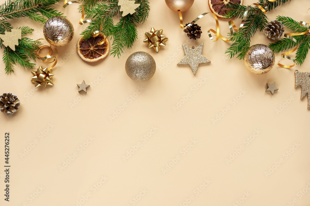 Christmas and New Year holiday background. Christmas tree branches, balls and spiral serpentine on yellow background. Top view, flat lay, copy space