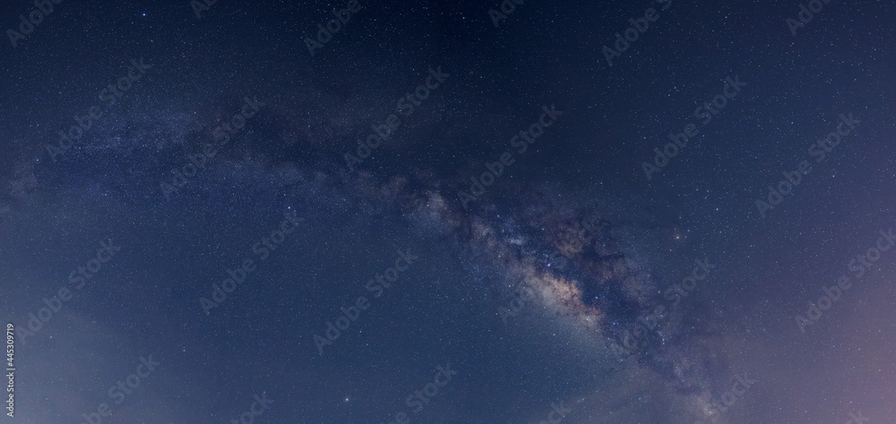 Panorama blue night sky milky way and star on dark background. Universe filled with stars, nebula and galaxy with noise and grain.Photo by long exposure and select white balance.selection focus.amazin