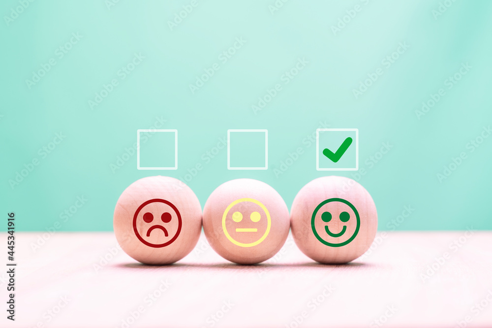 check mark on happy smiley face in wooden circle for feedback rating and positive customer review and world mental health day