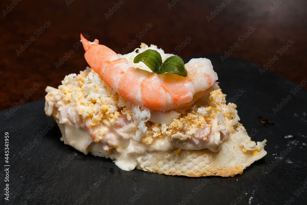 Pintxo de Cócktel de cangrejo y langostino del Hola Bar de Bilbao, Vizcaya, Pais Vasco.