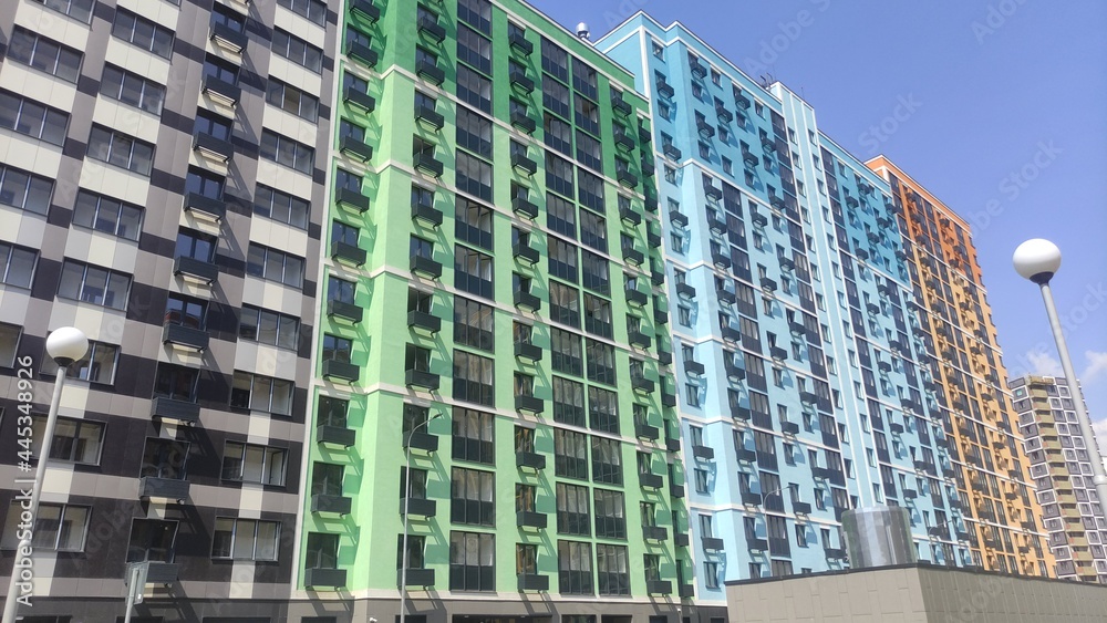 Multi-colored multi-storey new buildings with apartments against the blue sky in summer on a sunny bright day with beautiful bright facades with windows and glass