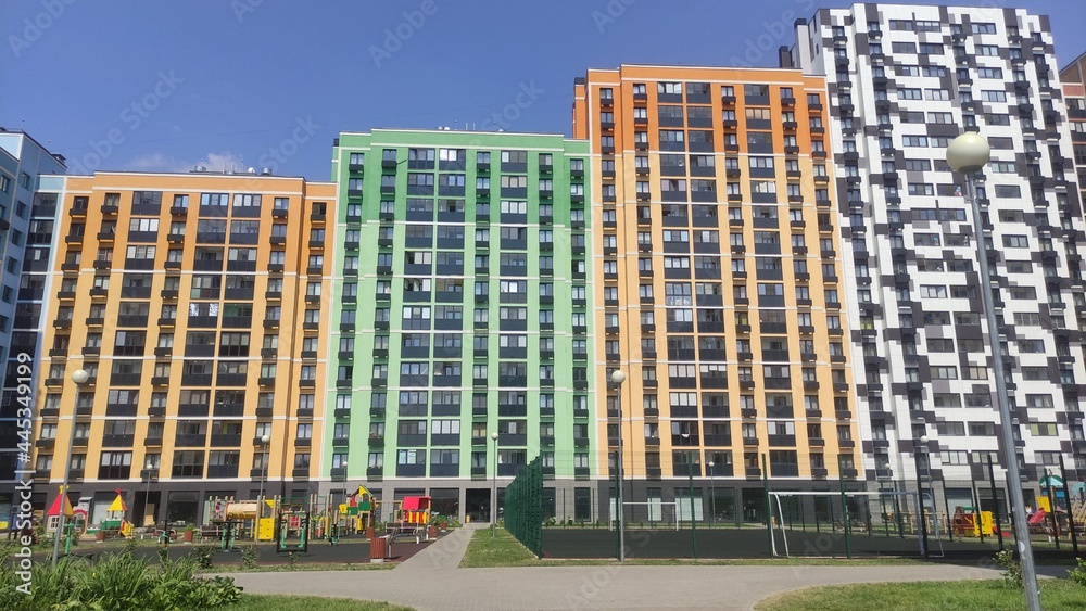 Multi-colored multi-storey new buildings with apartments against the blue sky in summer on a sunny bright day with beautiful bright facades with windows and glass