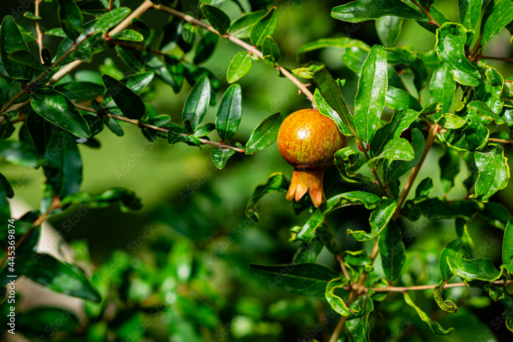 Granada en proceso de maduración en el árbol, aún es pequeña pero en unos meses estará madura