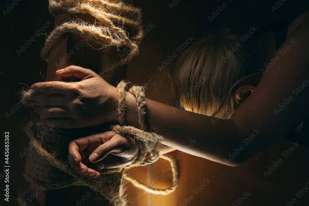Blond woman tied to the wooden beam with shabby rope, lying on the floor