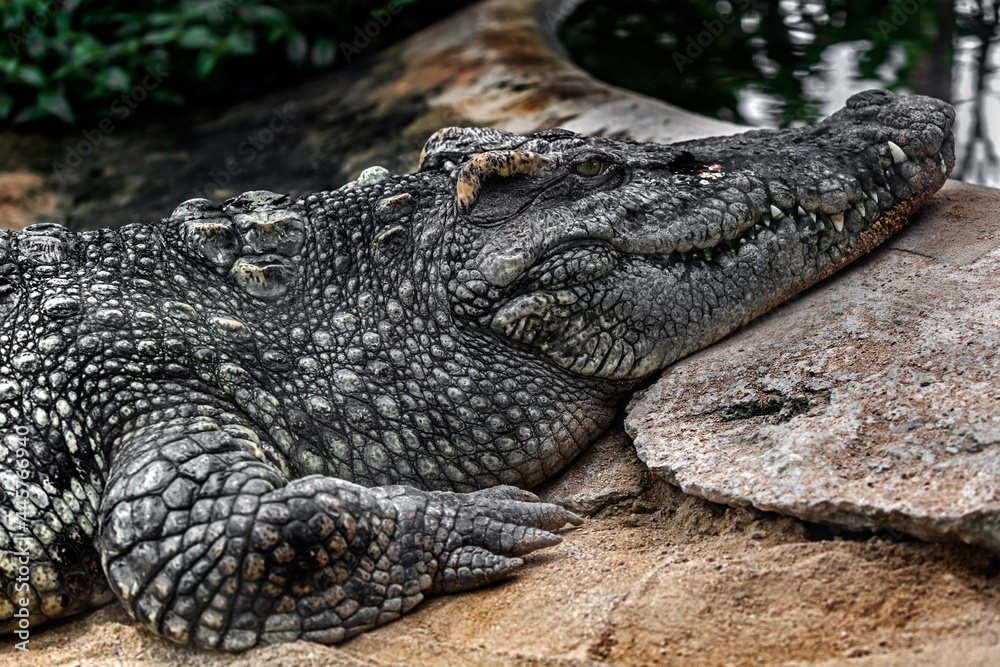 Siam crocodile near the pond. Latin name - Crocodylus siamensis