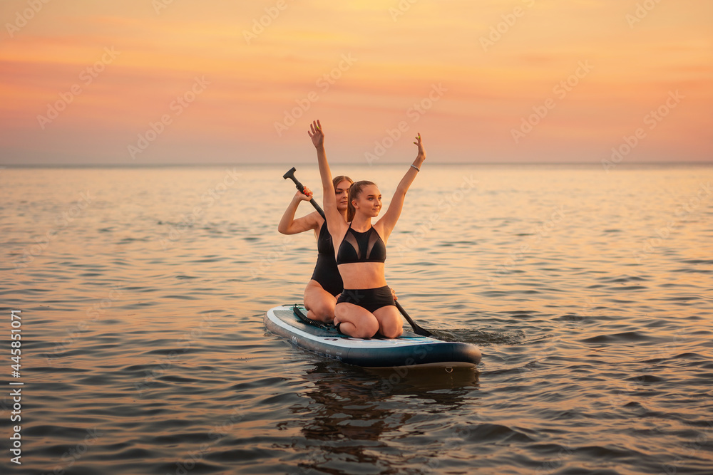 Summer surfing. Two happy women swimming on a sup board. In the background, the ocean and the sunset. Summer extreme recreation