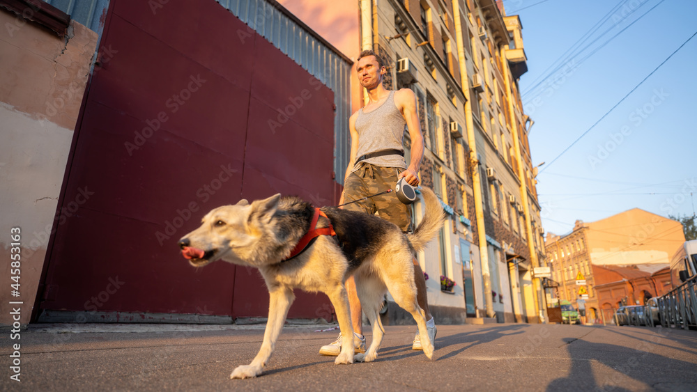 Walking the dog with the owner. walking around the city